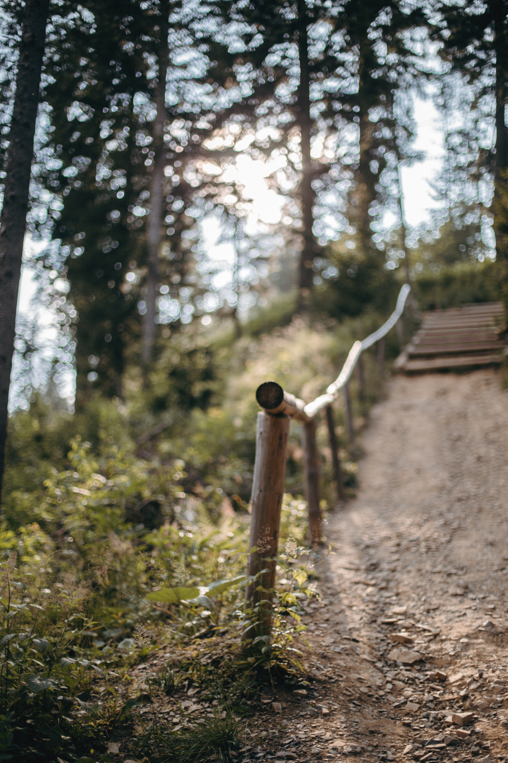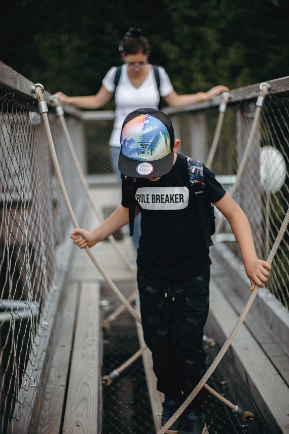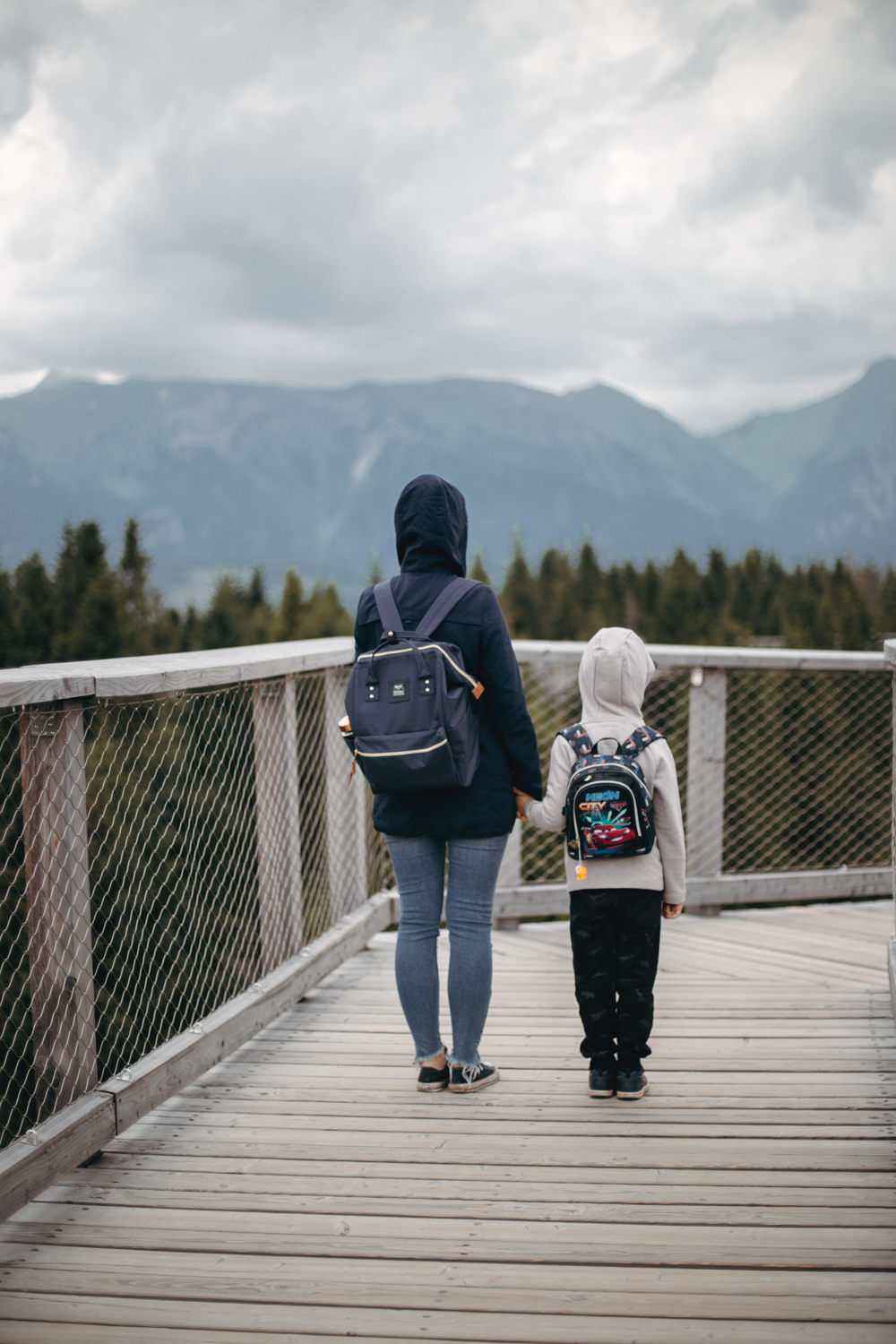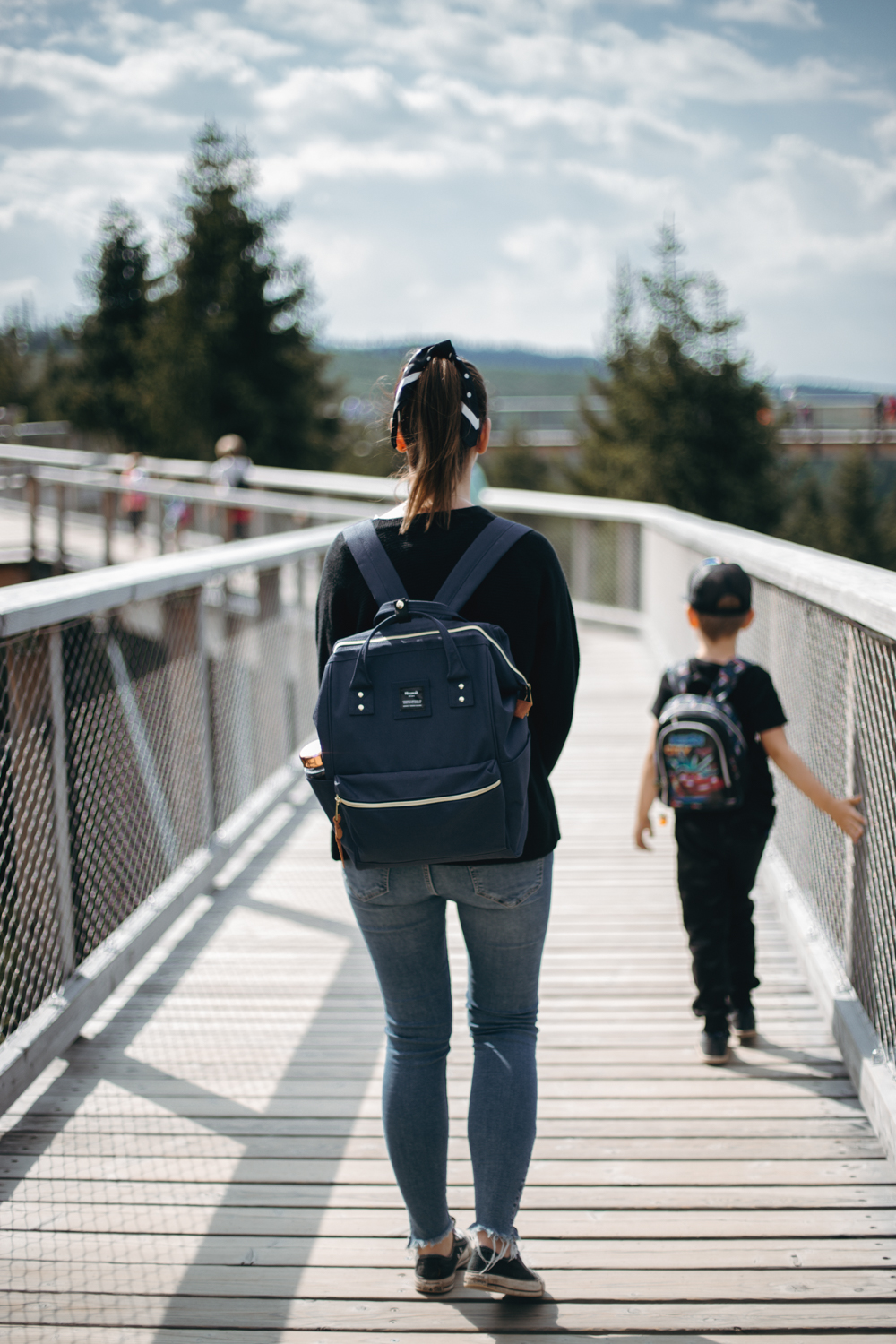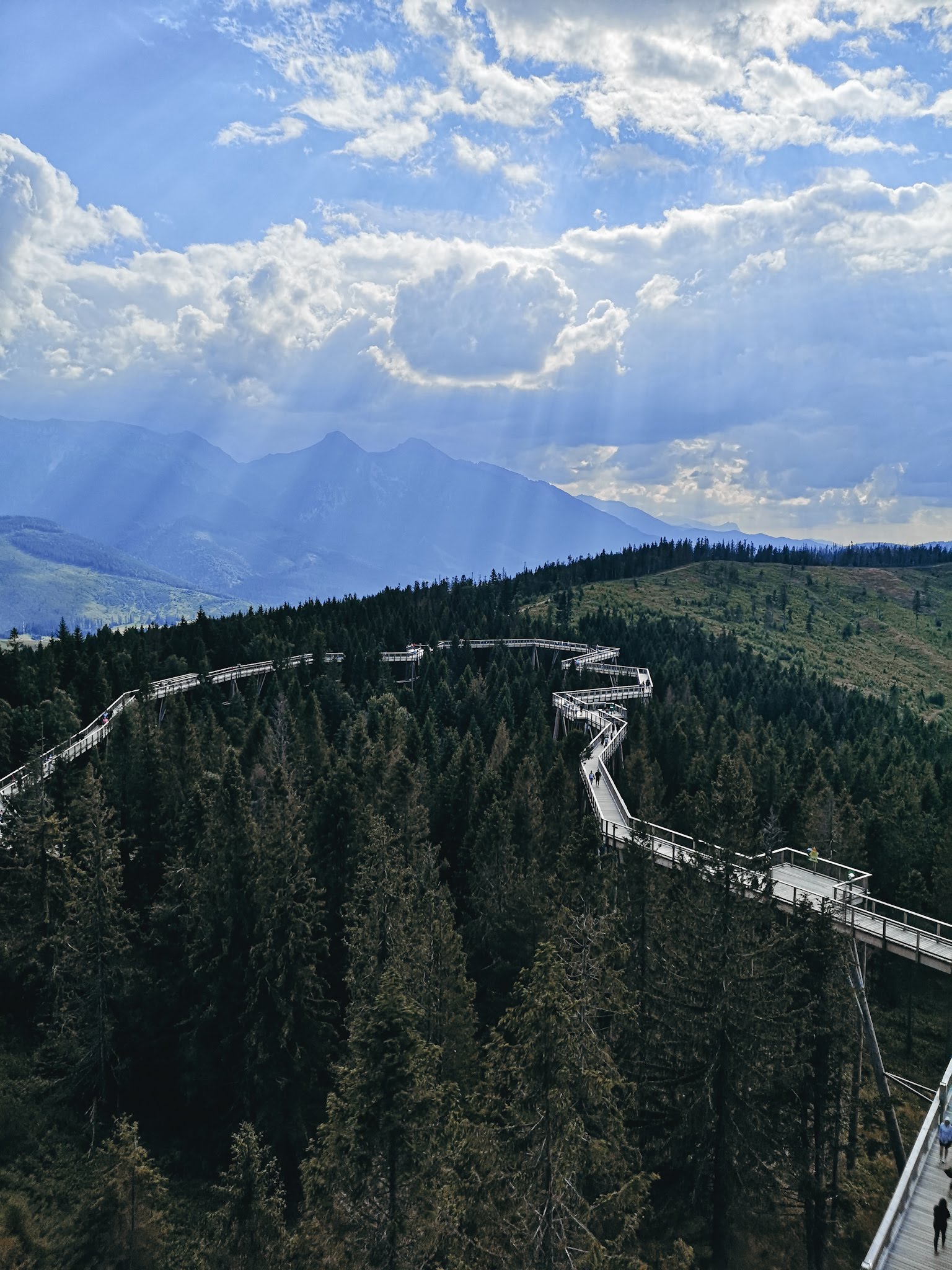 U bram czeka nas kolejna ciężka decyzja: czy jechać do celu wyciągiem, czy pójść na nogach, bo okazuje się, że sto złotych piechotą chodzi i to kilometr pod górę, choć plotka głosi, że jednak 2,6 kilometra. Trudno mi powiedzieć, natomiast spokojnie daliśmy radę z sześciolatkiem i dwiema osobami w podeszłym wieku 30 lat. Sam drewniany chodnik w koronach drzew jest całkiem przyjemny i nawet nieźle komponuje się z otoczeniem – widoki są piękne, a syn mówił, że widział nawet wieżę Eiffla, ale ja mam wadę wzroku, więc nie potwierdzam. Trochę też wieje.